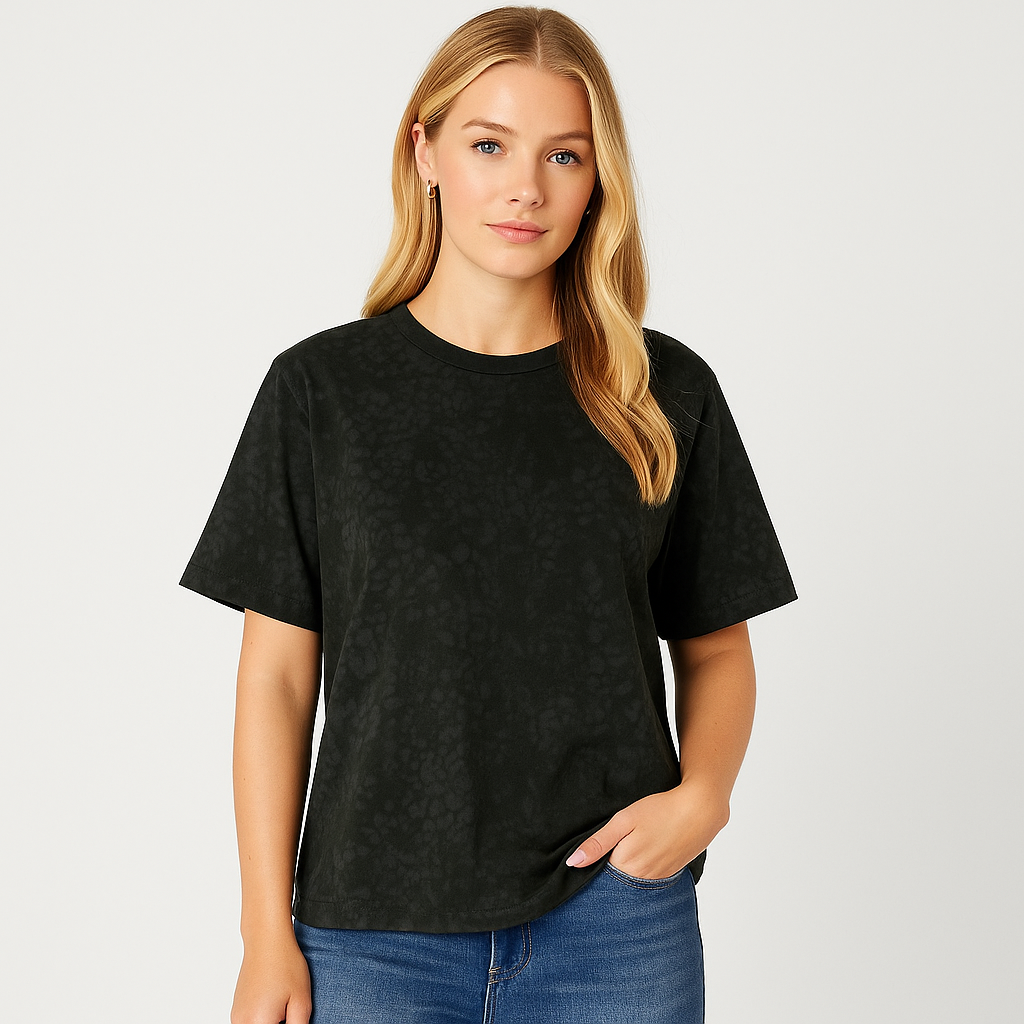 Embrace an effortlessly cool vibe with the Ysella Shadow Print Tee. Designed in a moody charcoal base with an abstract tonal pattern, this piece delivers understated edge with versatile appeal. Its relaxed fit makes it the perfect go-to for laid-back style while still keeping you fashion-forward. Pair it with denim, leather, or layers to create a look that’s uniquely yours.