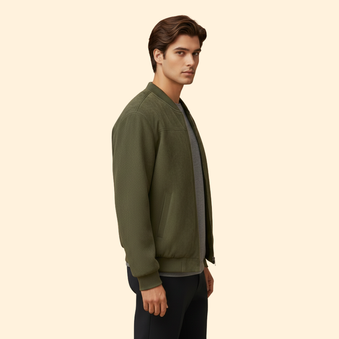 Jacket featuring a bomber silhouette with long sleeves, front zipper, and stretch cuffs. The exterior presents a smooth surface suitable for varied outfits. Lightweight construction allows use in different settings. The piece includes a ribbed collar and hem for a structured finish.