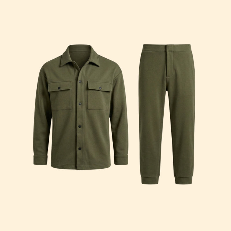 This two-piece men's set includes a long-sleeve shirt with a button placket and trousers with a relaxed fit. Both items are made from lightweight, breathable fabric ideal for year-round use. The shirt features chest pockets, while the trousers have an elastic waistband and ankle cuffs, offering a coordinated look for everyday wear.