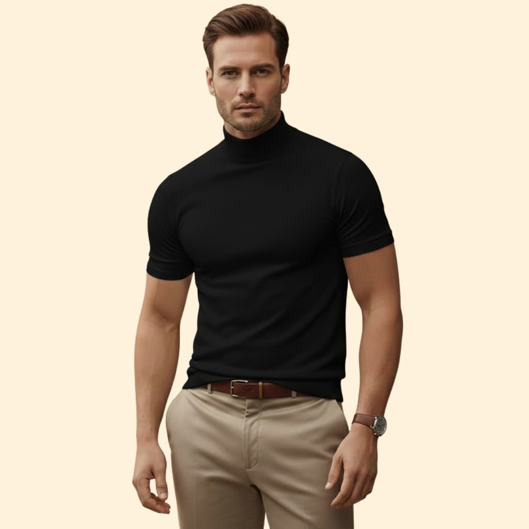 This men's casual T-shirt features a short-sleeve design and a mock neck detail. It is suitable for leisure activities or relaxed days. The shirt offers a comfortable fit, making it versatile for everyday wear. The mock neck adds a stylish touch to the simple design.