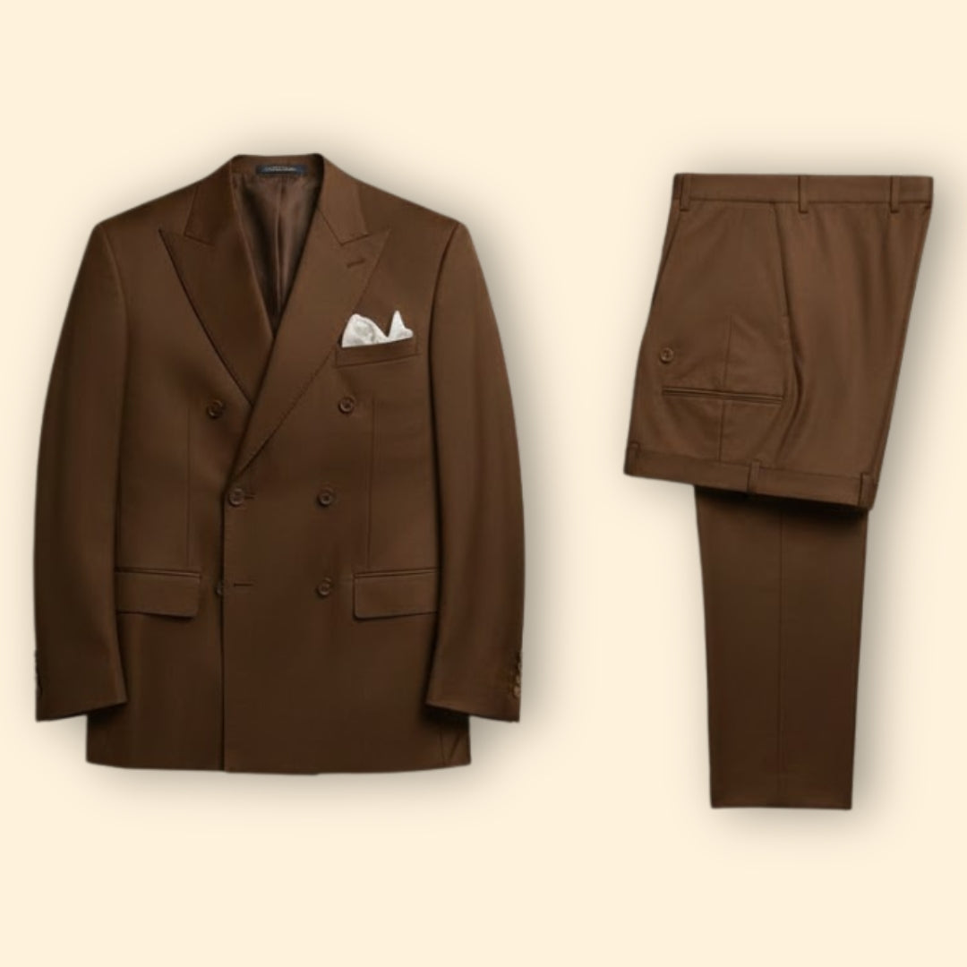 This set includes a double-breasted jacket with six front buttons, a notched lapel, two flap pockets, and a single chest pocket. The matching trousers have a structured waistband and a straight hem. The outer surface shows a finely woven pattern across the set.