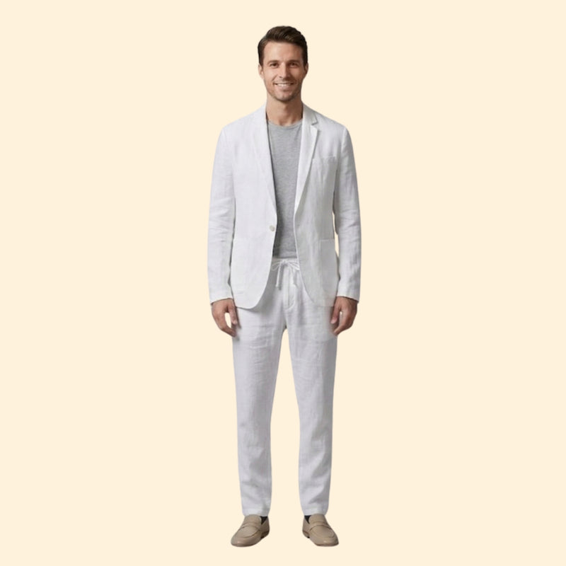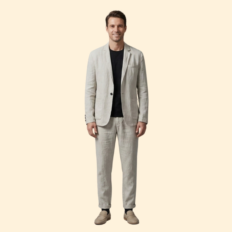 This two-piece men's suit set includes a blazer and trousers, made from lightweight fabric ideal for spring, summer, and early autumn. The blazer features a notched lapel, button closure, patch pockets, and back vent. The trousers offer a straight fit with an elastic waistband and functional flap pockets.