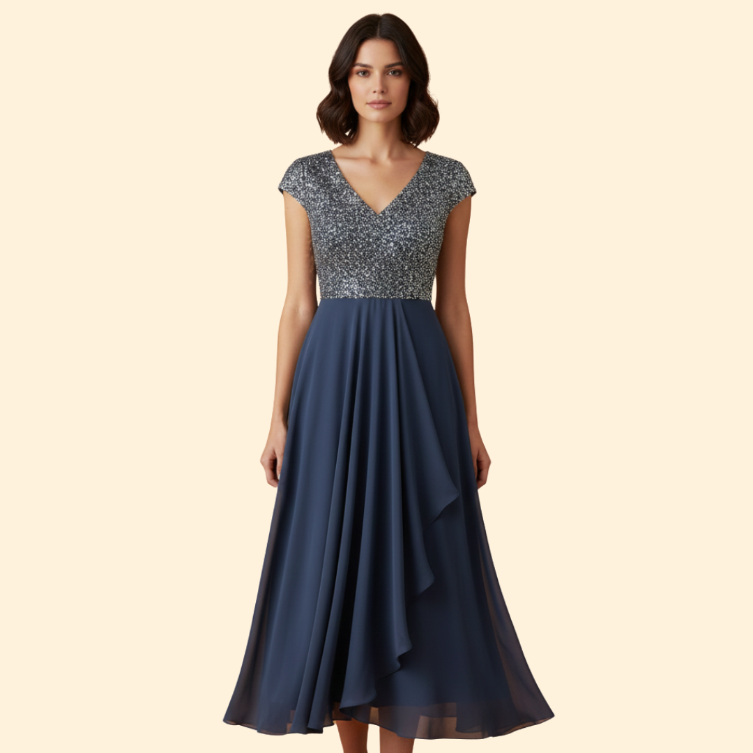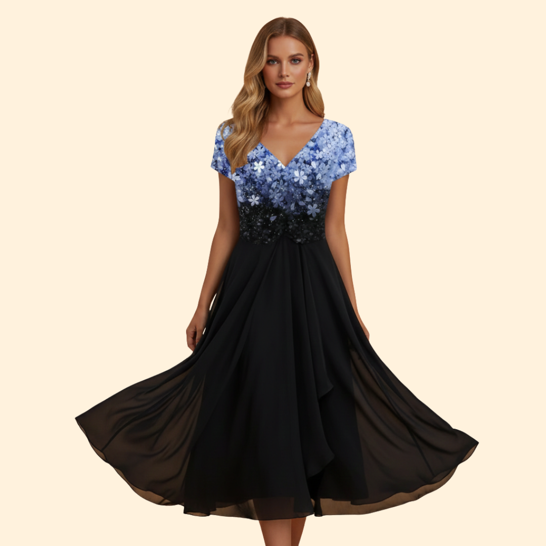 This evening dress features a V-neckline and short sleeves for a classic, feminine design. The bodice is adorned with floral details, and the flowing skirt offers ease of movement. Ideal for special occasions, it combines elegance with a flattering silhouette. Machine washable for easy care.