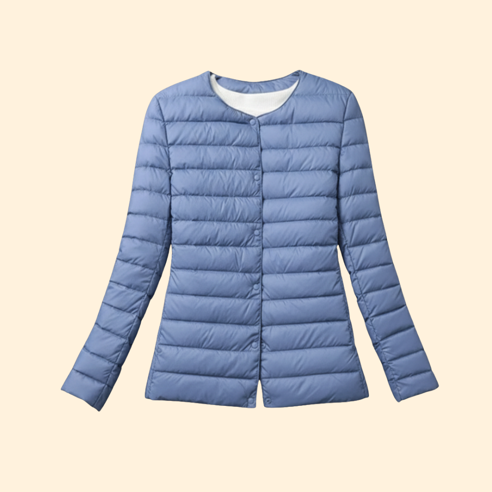 This lightweight down jacket features effective thermal insulation for warmth in cool temperatures. The jacket is designed with a matte finish and functional pockets for added convenience. Its versatile design makes it suitable for various outdoor activities, providing both comfort and practical storage space.