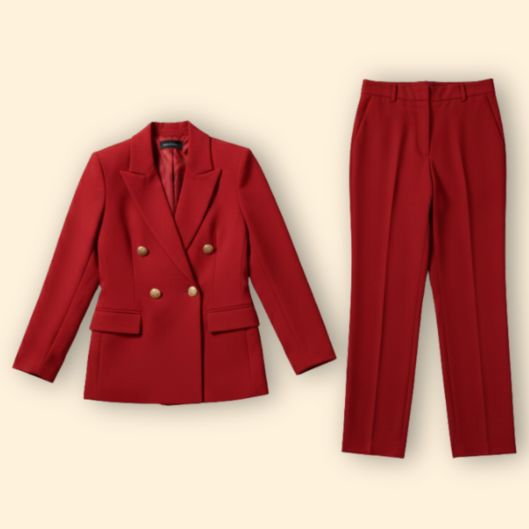 This two-piece suit set includes a blazer with a notched lapel, long sleeves, front flap pockets, and metal buttons. The coordinated trousers display a slim straight leg with a fitted waistband and simple hem, both pieces showing a smooth woven surface.